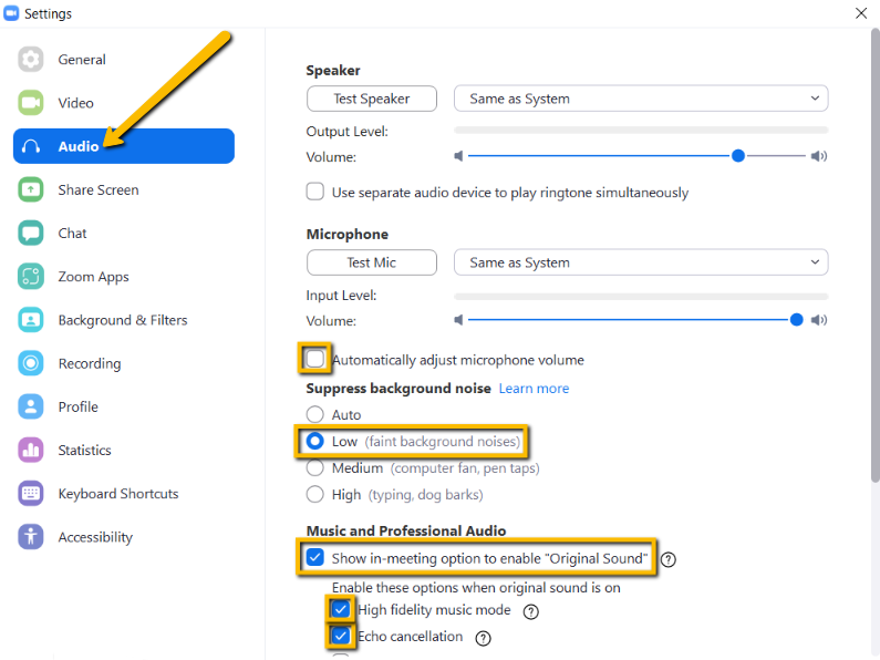 - Set Suppress background noise to Low